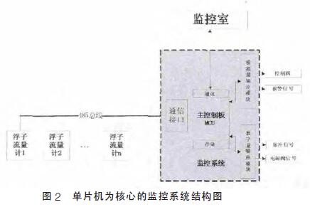浮子流量計(jì)監(jiān)控系統(tǒng)主要功能是模擬量采集輸出, 數(shù)字量采集輸出,由核心模塊進(jìn)行分析、處理、存儲(chǔ)并和上位機(jī)通信。工業(yè)上常用的監(jiān)控系統(tǒng),從組成結(jié)構(gòu)來看主要分為PLC為核心的監(jiān)控系統(tǒng)、現(xiàn)場(chǎng)總線為核心的監(jiān)控系統(tǒng)、單片機(jī)為核心的監(jiān)控系統(tǒng)。本設(shè)計(jì)主要采用以單片機(jī)為核心的監(jiān)控方法,該系統(tǒng)使用廣泛,體積小、功耗低、操作方便、設(shè)計(jì)簡(jiǎn)便、成本低,是許多小型監(jiān)控系統(tǒng)的*選。單片機(jī)為核心的監(jiān)控系統(tǒng)結(jié)構(gòu)如圖2所示。本監(jiān)測(cè)系統(tǒng)主要包括現(xiàn)場(chǎng)浮子流量計(jì)組、485總線、主控制板MCU 以及模擬數(shù)字輸出控制模塊。