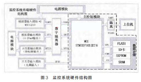 現(xiàn)場(chǎng)浮子流量計(jì)監(jiān)控系統(tǒng)的總體結(jié)構(gòu)如圖2所示。其中硬件系統(tǒng)主要功能是模擬量(溫度、儀表信號(hào))的采集,模擬量(4~20mA 電流)的輸出,開關(guān)量的輸入輸出以及遠(yuǎn)距離RS485串行通訊和數(shù)據(jù)存儲(chǔ)。其中監(jiān)測(cè)系統(tǒng)硬件結(jié)構(gòu)如圖3 所示。為增強(qiáng)監(jiān)測(cè)系統(tǒng)的抗干擾能力, 本設(shè)計(jì)采用帶隔離的電源模塊以及數(shù)字隔離器確保系統(tǒng)能夠高效穩(wěn)定工作。