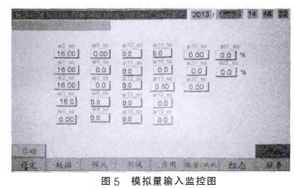 上位機(jī)觸控屏軟件是利用觸控屏供應(yīng)商的組態(tài)軟件設(shè)計(jì)的,作為一個(gè)將運(yùn)用于工業(yè)現(xiàn)場(chǎng)的監(jiān)控設(shè)備,其實(shí)用性和易用性是使用者比較重視的。當(dāng)下位機(jī)的通訊任務(wù)接收到信號(hào)量, 主控制模塊就會(huì)開始和上位機(jī)通信。下位機(jī)將采集到處理完整的數(shù)據(jù)傳輸?shù)缴衔粰C(jī)內(nèi),上位機(jī)將其顯示到觸控屏上,使用者可以通過上位機(jī)了解空壓機(jī)組的實(shí)時(shí)狀態(tài)。圖5 和圖6 就是模擬量和數(shù)字量各個(gè)通道的實(shí)時(shí)值顯示畫面。