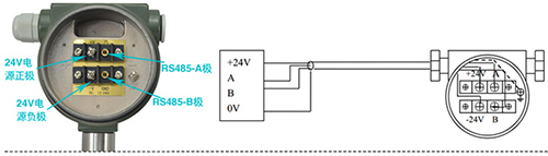 帶RS-485通訊功能的渦街流量計采用DC24V電源供電,與其它設備之間采用四線制傳輸方式。儀表端子接線見圖