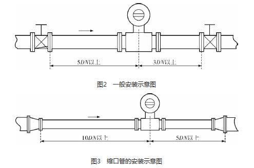 堿液計量表的安裝質(zhì)量對其測量結(jié)果的影響較大,因此在安裝時需要注意幾個問題。*先,堿液計量表直管段的選擇在配管時一定要按照要求進行選擇,一般選擇流量計通徑與工藝管道通徑相同,即可滿足工程需要,而且安裝方便、壓力損失小,流量計直管段上游側(cè)的長度不少于5倍工藝管道直徑,下游側(cè)的長度不少于3倍工藝管道直徑(圖2)。但在流速太慢而又要求精度較高或需要變徑的應(yīng)用場合,可選擇通徑小于工藝管道通徑的流量計,以提高測量精度,此時流量計上、下游必須加裝異徑管,且進口異徑管上游側(cè)應(yīng)有長于10倍工藝管道直徑的直管段,下游側(cè)應(yīng)有長于5倍工藝管道直徑的直管段(圖3)。