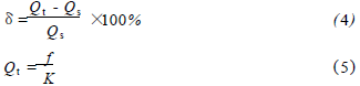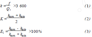 過(guò)熱蒸汽流量計(jì)在標(biāo)準(zhǔn)水裝置上,分別用頻譜分析和脈沖計(jì)數(shù)的方法進(jìn)行標(biāo)定,流體介質(zhì)為水未加氣體,采用的標(biāo)準(zhǔn)傳感器為精度等級(jí)為0.2級(jí)的電磁流量計(jì)。在每個(gè)流量測(cè)量點(diǎn)上的儀表系數(shù)用公式(1)計(jì)算,然后用式(2)計(jì)算得到*終儀表系數(shù)K。Ql為被測(cè)水的流量值,f為每一個(gè)流量點(diǎn)得到的頻率,k為每個(gè)測(cè)量點(diǎn)得到的儀表系數(shù)。kmax、kmin分別為試驗(yàn)流量范圍內(nèi)得到的*大與*小的儀表系數(shù)。儀表系數(shù)的線(xiàn)性度E1用式(3)來(lái)計(jì)算。