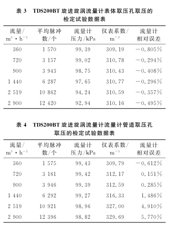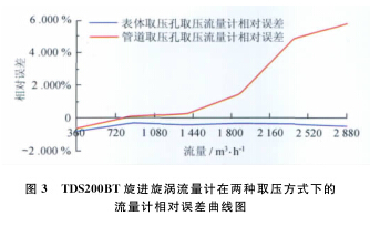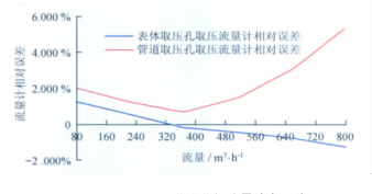 從以上數(shù)據(jù)表和曲線圖中可以看出:空氣流量計型號一定的情況下,用表體取壓孔取壓方式檢定流量計時流量計的線性度較好,用管道取壓孔取壓方式檢定流量計時流量計的線性度較差;流量測點相同的情況下,表體取壓孔取壓檢定方式的流量計誤差較小,管道取壓孔取壓檢定方式的流量計誤差較大;兩種取壓方式引起的誤差隨著流量的增大而逐漸增大,在流量為2 900m3/h時兩者相差近6.2%,遠遠超出了流量計的準確度等級。所以,在空氣流量計的檢定過程中,應(yīng)避免在流量計表體取壓孔以外的地方取壓進行檢定。
