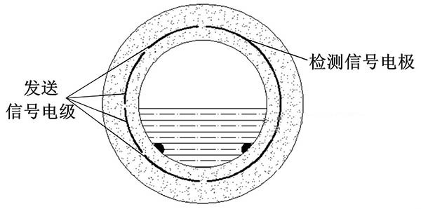 ③利用阻抗或信號衰減研制的非滿管工業(yè)污水流量計。這種結構的非滿管工業(yè)污水流量計是當前國內研究的方向之一。其結構是流量管底部貼一對信號發(fā)射電極,在流量管中間貼信號接收電極。由于信號在流體中傳播會產生衰減,且傳播時間越長,衰減越多,因此通過信號接收電極接收到的信號衰減量即可得知液面高度;同時該電極還能測量流體切割磁感線產生的電動勢,以此達到測量非滿管流量的目的。阻抗式或信號衰減非滿管工業(yè)污水流量計結構簡圖如圖5所示。