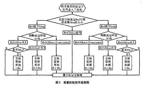 實際生產中流量一直在某個區域內波動,且其動態特性不易掌握。從上面的理論中我們能夠讓誤差△£盡可能的小,這樣距我們所需要的理論值%就越接近。而減小誤差需要我們把n取的盡可能大,也就是在生產時間內劃分更多的周期去調節流量。當工控機根據一體化污水流量計傳送回來的信號發出調節變頻器工作頻率的指令后,電機調整功率到一體化污水流量計的實際測量為一個工作周期,我們知道從指令發送到實際測量值返回有一個較大的滯后,如果調節的周期時間小于流量計本身的一個工作周期,那么顯然不可能達到減小誤差的目的。利用模糊控制思想H。,在控制程序中我們把流量的波動區域劃分為±缸×Yo,Yo-t-O.3,Yo±0.5四個區域,其中缸為可調節的誤差范圍,生產中我們取0.015,流量區域劃分的單位均為t/h。針對不同的區域采取不同的調整方案。具體流程如圖3所示。圖中變量Rel表示實際測量的流量,變量Idea表示理論流量。