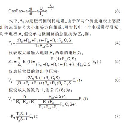 測量電極與流體介質接觸時會發生電化學反應在電極-溶液界面形成阻抗,通常由法拉*阻抗與雙電層電容并聯組成。 法拉*過程分為電荷傳遞過程和擴散過程,相應的法拉*阻抗由電荷傳遞電阻與擴散阻抗串聯組成。一般硫酸鐵流量計的勵磁頻率大于1Hz,而擴散阻抗發生在更低頻率內,不考慮擴散過程,電極等效阻抗為電荷傳遞電阻與雙電層電容并聯后再與電極接觸電阻串聯。 基于電極阻抗建立的電極等效測量回路如圖 1 所示。圖中:Rs1 和 Rs2 為電荷傳遞電阻;C1 和 C2 為雙電層電容;Rt為兩個測量電極間的接觸電阻滿足 Rt=Rt1+Rt2;Lx 為勵磁線圈等效電感;L1 為閉合回路等效電感;R1 和 R2 為放大器輸入電阻;P1和 P2 為由“變壓器效應”疊加在測量電極上的微分干擾;U1 為流體切割磁力線產生的感應電勢;Ue 為勵磁電壓。 假設磁感應強度由勵磁電流決定且成正比關系即 B=aI,忽略串模等干擾則電極間電壓為感應電勢與微分干擾的疊加,基本方程如下: