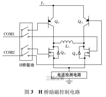 如圖2 所示,在對傳感器線圈進行勵磁時,通過比較器控制切換開關切換高低壓進行勵磁。V ref 作為比較器的基準輸入端,其表示勵磁電流的電壓穩態值;而 C ur 則表示 H 橋勵磁電路中檢測到的電壓信號。一開始當系統處于低壓勵磁狀態時,系統會自動斷開切換電路中的電流旁路,此時系統通過利用 H 橋向勵磁線圈提供恒定電流。當勵磁方向變化時,電流檢測電路就會檢測到電流變為負方向,比較器的 C ur 端與V ref 端的平衡就會發生變化,此時系統通過比較器自動切換為高壓勵磁狀態。與低壓勵磁方式相反,在此種狀態下,恒流控制電路關閉而電流旁路打開,線圈中的能量就會存儲在能量回饋電路中,此時 C 1 端的電壓會超過高壓源。等勵磁線圈中的能量釋放完后,電流逐漸降為零,此時能量回饋電路就會利用電流旁路和 H 橋將能量反饋給勵磁線圈。當電容 C 1 端的電壓下降到小于高壓源時,系統就會自動通過電流旁路和H 橋直接對勵磁線圈進行勵磁,當勵磁線圈中的電流超過設定閾值時,C ur 端電壓就會大于 V ref 點電壓,此時比較器又會切換成低壓勵磁方式,如此反復循環控制,達到對勵磁線圈恒流控制的目的。圖 3 為 H 橋勵磁控制電路。