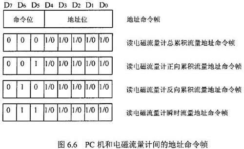 由于RS一485電氣標準規定每段只能聯結犯個節點設備,因此可用地址幀中五個二進制位表示這32個地址,其余3位用來表示命令,從而構成地址命令幀。對于控制命令需求不超過八個的通信系統,采用地址命令幀可壓縮報文長度提高通信效率。在污水網絡監控系統中,分體式電磁流量計和PC機通信的主要目的是將流量計中的有用數據讀到PC機中。這些數據包括:總累積流量、正向累積流量、反向累積流量、瞬時流量。通信時,PC機只需向分體式電磁流量計發送讀總累積流量、讀正向累積流量、讀反向累積流量、讀瞬時流量命令即可,因此二者間通信所用的地址幀和命令幀可合二為一,用一個地址命令幀代替。PC機和分體式電磁流量計間的地址命令幀定義如圖.66所示。根據污水網絡監控系統中PC機與分體式電磁流量計間通信的特殊性,二者通信所使用的報文可簡化為圖.67的格式。