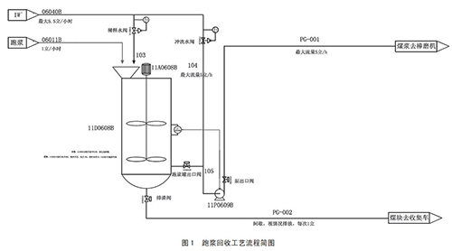 通過以上煤漿提濃通用方法優缺點比較可以了解到,在現有設計條件基礎上,煤漿濃度提升會帶來一定設備損耗及能源損耗。針對這種情況,為了達到節能而保證蒸汽流量計不跑漿,對于磨機跑漿問題進行改善,對跑漿進行回收,重新送回磨煤機進行二次研磨,降低了蒸汽流量計入口原料煤的粒度;同時降低了人員勞動強度,改善了現場衛生情況。具體跑漿回收裝置設計流程如圖 1 所示。