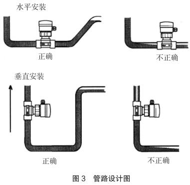 現(xiàn)場安裝時(shí)應(yīng)注意遠(yuǎn)離可能對(duì)其產(chǎn)生干擾的大型設(shè)備,防止長期的熱輻射和其他如磁場直射等環(huán)境影響。為確保高測量精度和較好的零點(diǎn)穩(wěn)定性,進(jìn)行校正前,高壓電磁流量計(jì)應(yīng)裝入工藝介質(zhì)中至少 24 小時(shí)電極鈍化。安裝的管路設(shè)計(jì)應(yīng)確保管道始終充滿流體,防止測量誤差,管路設(shè)計(jì)圖見圖 3。
