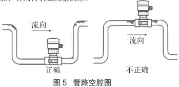 測量流向取決于高壓電磁流量計(jì)的安裝方位,將高壓電磁流量計(jì)在接頭上旋轉(zhuǎn) 180 度即可反向。正流向時(shí),高壓電磁流量計(jì)的突耳應(yīng)在上游方向。流量顯示總是正的,而累加器可以根據(jù)流向增加或者減少。安裝中確認(rèn)管路設(shè)計(jì)不允許在介質(zhì)中產(chǎn)生氣泡或空腔,否則將引起測量誤差(見圖 5)。