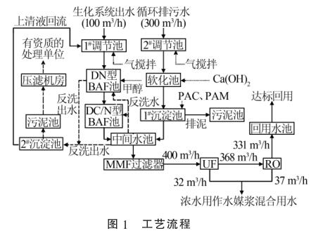 2種廢水在中間水池混勻后,通過泵提升進入保安過濾器,進一步去除細小的懸浮物后經過增壓泵進入超濾膜(UF)處理系統和反滲透(RO)系統,然后通過管道式電磁流量計進行計量。反滲透出水直接進入回用水池達標回用,超濾濃水以及反滲透濃水用作水煤漿混合用水。污泥池中的污泥通過泵打入帶式機壓濾處理,濾液自流進入1#調節池。工藝流程見圖1。