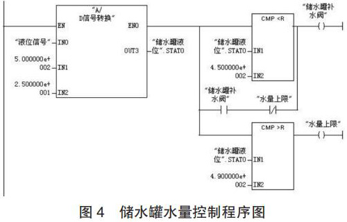(2)程序設計。儲水罐水量控制的工作過程為:當壓力變送器檢測到儲水罐的水量低于 450kg 時,補水閥 3 開啟為儲水罐補水;當水量達到 490kg 時,補水閥 3 關閉;生產配制過程中,循環以上控制過程。儲水罐水量控制的程序如圖 4 所示。