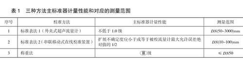 本規(guī)范包含三種校準(zhǔn)方法,分別為標(biāo)準(zhǔn)表法 1(外夾式超聲流量計)、標(biāo)準(zhǔn)表法 2(串聯(lián)移動式在線校準(zhǔn)裝置)和稱重法,編制組對每種方法進(jìn)行了大量的實驗,并積極與管道式流量計生產(chǎn)廠家及用戶溝通探討,積累了豐富的經(jīng)驗,獲得了大量的實驗數(shù)據(jù),*終確定三種方法的主標(biāo)準(zhǔn)器計量性能和對應(yīng)的測量范圍,如表 1 所示。