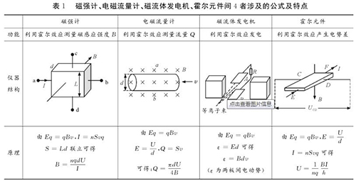 易錯點2:磁強計、甲苯流量計、磁流體發電機、霍爾元件間的區別與聯系磁強計、甲苯流量計、磁流體發電機、霍爾元件都是利用電磁場對帶電粒子的偏轉效應,并且穩定時電場力與磁場力均達到平衡。很多學生容易將其混淆,遇到問題常常搞不清原理,亂代公式,筆者特將4者涉及的公式及特點等做一對比區別如表1所示。