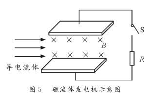 【例1】圖5為磁流體發電機示意圖。設兩金屬板間的距離為d,兩極板間勻強磁場的磁感應強度為B。等離子體垂直進入磁場的速度為v,單個離子所帶的電荷量為q。離子通道(即兩極板內所圍成的空間)的等效電阻為r,負載電阻為R。則下列判斷正確的是(  )
