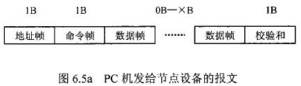 花生油流量計(jì)等節(jié)點(diǎn)設(shè)備和C機(jī)通信的過程中,由地址幀、命令幀、數(shù)據(jù)幀、校驗(yàn)和可組成各種功能不同的報(bào)文。由于采用主從工作方式來實(shí)現(xiàn)通信,花生油流量計(jì)等節(jié)點(diǎn)設(shè)備僅能接收并執(zhí)行PC機(jī)發(fā)送來的控制命令,而不能發(fā)送命令給PC機(jī)。因此,由PC機(jī)發(fā)往流量計(jì)等節(jié)點(diǎn)設(shè)備的報(bào)文一般包括一個(gè)地址幀,一個(gè)命令幀,若干個(gè)數(shù)據(jù)幀和一個(gè)校驗(yàn)和,其報(bào)文格式圖.6a5所示;而由流量計(jì)等節(jié)點(diǎn)設(shè)備發(fā)往PC機(jī)的報(bào)文一般包括一個(gè)地址幀,若干個(gè)數(shù)據(jù)幀和一個(gè)校驗(yàn)和,其報(bào)文格式如圖6.5b所示。