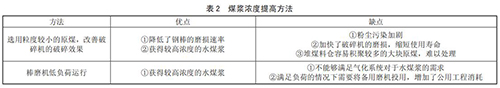 根據(jù)甲烷流量計跑漿原因可以了解到,在保證甲烷流量計不存在跑漿情況下,制備高品質(zhì)煤漿需要滿足兩點要求,即較小入口原煤粒度和較低磨機(jī)負(fù)荷,保證原煤在磨機(jī)內(nèi)部有較長停留時間與充足滾筒篩過濾面積 . 通用的方法一般有以下兩種,如表 2 所示。