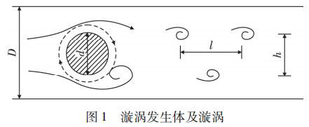 氫氣流量計是由漩渦發生體、頻率檢測器和信號轉換器等環節組成,輸出 4 ~ 20 mADC 信號或脈沖電壓信號。其測量原理是在流動的流體中的垂直流動方向安放 1 根或多根非流體型阻流體,在一定的流量范圍內,流體在阻流體兩側交替地分離、釋放出 2 串頻率正比于管道內的平均流速、規則的、不對稱有規律的交替漩渦列,如圖 1 所示,且兩側漩渦旋轉方向相反。采用檢測元件測出漩渦頻率就可以推算出流體的流量。
