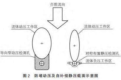 二氧化氯流量計采用拋物面導向型結構作為動壓測點,采用對稱自補償型式的靜壓測點,可以有效地解決來流方向偏流時信號的穩定采集,來流偏離管道軸線時,可以維持輸出差壓基本不變,如圖2所示。