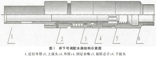 井下可調配水器主要由定位導管、上接 頭、外 筒、旋轉芯子、固定水嘴、下接頭等部件組成,如圖1
