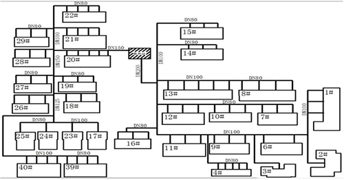 某小區住宅樓建設于1996年,建筑結構為磚混建筑,建筑面積為54931m2,共30棟住宅樓。2017年繳費739戶,總采暖面積為47141m2。換熱站位于小區中部,板式換熱機組設計換熱面積為50000m2,循環泵額定功率為30kW,流量為200m³/h,揚程為32m。庭院管網共分為2個支狀供回水環路,該小區供熱管網見圖1所示。