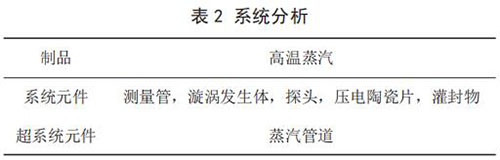建立已有系統的功能模型(見圖 1)。通過功能模型分析,描述了系統元件及其之間的相互關系,并得出導致傳感器耐受溫度不足問題的功能因素:高溫蒸氣對測量管傳熱;測量管對探頭傳熱;探頭對灌封物傳熱;灌封物對壓電陶瓷片傳熱;高溫蒸氣對探頭傳熱。