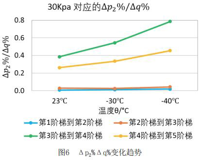 為了更直觀嚴(yán)謹(jǐn)?shù)膶Ρ让總€階段響應(yīng)速度的不同,對原始數(shù)據(jù)進(jìn)行處理,得到如下表格2和表格3。將△p2%/△q%作為響應(yīng)速度的直觀量化表達(dá),若△p2%/△q%的值大,說明單位流量變化照成的出口壓力變化大,即說明分體式電磁流量計響應(yīng)相對較慢,反之亦然。