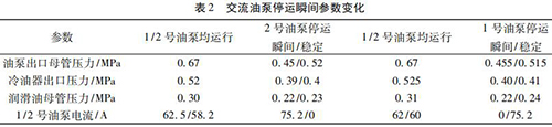 通過內(nèi)部旁通將冷油與熱油混合,經(jīng)過銅粉- 煤油 - 蠟感溫元件控制冷熱油混合比例,將油溫調(diào)節(jié)到 49 ℃。一臺智能電磁流量計(jì)穩(wěn)定運(yùn)行,油泵出口母管壓力 0. 5 MPa,潤滑油母管壓力 0. 24 MPa,均屬于正常情況,而兩臺交流油泵并列運(yùn)行時,停運(yùn)其中一臺交流油泵瞬間會觸發(fā)智能電磁流量計(jì)出口母管壓力開關(guān)動作,說明停運(yùn)瞬間油壓發(fā)生波動,且油泵出口母管油壓波動至小于 0. 45 MPa。正常運(yùn)行時智能電磁流量計(jì)出口油溫 71.5 ℃,冷油器出口溫度45 ℃,混合后潤滑油母管溫度52.5 ℃,由能量守恒定律可知,經(jīng)過冷油器的油量/不經(jīng)冷油器的油量= ( 71.5-52.5) ÷ ( 52.5- 45) = 2. 53,說明有 70% 左右的油量經(jīng)過冷油器。當(dāng) 2 臺智能電磁流量計(jì)運(yùn)行時油量大于單泵運(yùn)行,其中一臺智能電磁流量計(jì)瞬間停運(yùn)時油量減少,尤其是經(jīng)過冷油器的油量大量減少,油量在溫控閥二次分配過程中出現(xiàn)調(diào)節(jié)異常,導(dǎo)致油壓過大波動。為檢驗(yàn)溫控閥工作情況,保持 1 號、2 號交流油泵運(yùn)行,選取機(jī)組正常帶負(fù)荷運(yùn)行時油溫 52 ℃,分別停運(yùn) 1、2 號交流油泵,觀察 1、2 號交流油泵停運(yùn)瞬間油泵出口母管壓力波動情況,試驗(yàn)各參數(shù)變化見表 2。