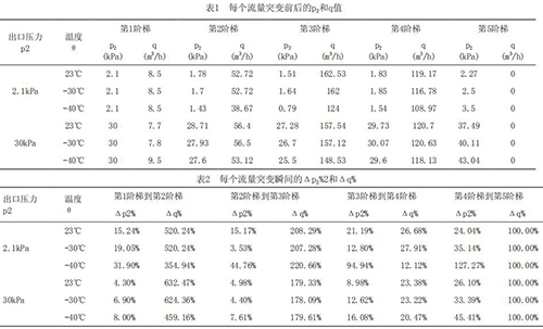 為了深入研究溫度及流量突變對高溫液體流量計響應(yīng)速度的影響趨勢,把每個流量突變點前后的出口壓力p2,流量q列表如表1所示。