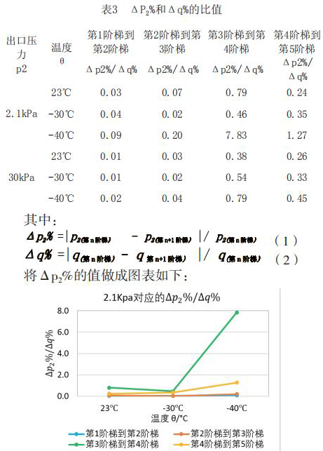 為了更直觀嚴(yán)謹?shù)膶Ρ让總€階段響應(yīng)速度的不同,對原始數(shù)據(jù)進行處理,得到如下表格2和表格3。將△p2%/△q%作為響應(yīng)速度的直觀量化表達,若△p2%/△q%的值大,說明單位流量變化照成的出口壓力變化大,即說明高溫液體流量計響應(yīng)相對較慢,反之亦然。