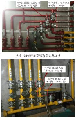 該水電廠在地衣輪機(jī)組檢修結(jié)束后針對(duì)上述弊端,結(jié)合透平油處理室油焦?fàn)t煤氣流量計(jì)布置的現(xiàn)狀,利用無(wú)機(jī)組檢修工作的汛期期間,對(duì)油處理室中油處理焦?fàn)t煤氣流量計(jì)進(jìn)行改造。具體改造內(nèi)容為:將各油桶的進(jìn)油和排油支管球閥后增加設(shè)置相關(guān)的臨時(shí)接口,便于油處理設(shè)備通過(guò)活接頭和軟管直接與各個(gè)油桶單好連接,可不受機(jī)組透平油供油、回油總管的臨時(shí)連接口限制。在支管上增設(shè)的臨時(shí)接口后各增加一個(gè)球閥,以便于將油桶中的油路切斷而進(jìn)行臨時(shí)接頭和軟管的連接。具體改造焦?fàn)t煤氣流量計(jì)效果見(jiàn)圖4、圖5所示。