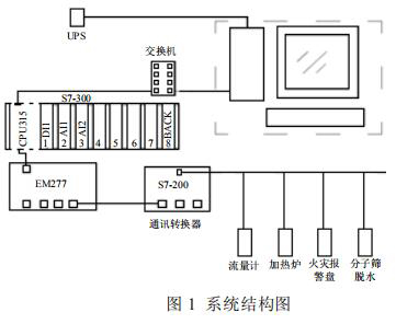 集氣站是收集氣井所生產(chǎn)天然氣的站場,在集氣站內(nèi)對天然氣進(jìn)行節(jié)流降壓、加熱、調(diào)壓計量等各種工藝預(yù)處理,設(shè)備眾多且分散。為方便進(jìn)行檢測和操作,必須進(jìn)行統(tǒng)一的數(shù)據(jù)采集,在監(jiān)控臺進(jìn)行數(shù)據(jù)的管理。集氣站設(shè)備主要包括加熱爐、衛(wèi)生型渦輪流量計、分子篩、火災(zāi)報警盤,以及供電設(shè)備 UPS 等,這些不同廠家的設(shè)備基本都支持Modbus 協(xié)議,通過 Modbus 通訊可以將這些數(shù)據(jù)采集。為了有效降低成本,設(shè)計了如圖 1 所示的系統(tǒng)。系統(tǒng)采用西門子 S7-300 控制器,通過以太網(wǎng)連接上位機(jī)監(jiān)控軟件,再通過 MP277 連接S7-200 的方式。S7-200 控制器自帶 RS485 接口,能夠進(jìn)行 Modbus 通訊,采集現(xiàn)場各種設(shè)備數(shù)據(jù)。*后通過以太網(wǎng)通訊將設(shè)備數(shù)據(jù)上傳至監(jiān)控軟件,方便操作人員進(jìn)行監(jiān)控,該方案簡單有效,能夠?qū)崿F(xiàn)集氣站內(nèi)設(shè)備的狀態(tài)監(jiān)控,數(shù)據(jù)處理,有效的進(jìn)行天然氣的生產(chǎn)工作。