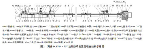 如圖 2 所示,DLFP14 - 70T 注脂防噴盒有 1 個注脂口、1 個回脂口、1 個防噴盒液控口、1 個刮纜器液控口及1 個溢流口,主體內裝有 6 根阻流管。DLFP14 - 70T 注脂防噴盒采用 4 級密封: * 1 級密封采用注脂密封,撬裝注脂泵從注脂口注入高壓高粘度密封脂于 6 根阻流管與電纜間隙; * 2 級密封采用液壓密封,氣動液壓泵主加壓和手壓泵補加壓結合從防噴盒液控口注入液壓油,推動活塞擠壓膠芯壓筒; * 3 級密封采用液壓密封,手壓泵加壓從刮纜器液控口注入液壓油,推動活塞擠壓膠芯壓筒實現密封和刮油作用; * 4 級密封油杯、橡膠盤根和刮油環( 鋼 墊) 。DLFP14 - 70T 注脂防噴裝置配有液控上、下捕捉器、液控雙閘板防噴器和放噴組件,根據實際可以調整溢流量,實現零溢流密閉測井施工。 DLFP14 - 70T 注脂防噴裝置工作壓力 70 MPa,耐壓105 MPa。