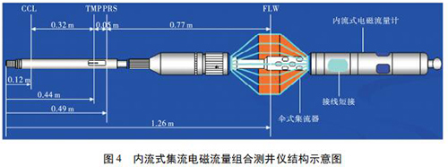 1. 2 內流式集流智能型渦輪流量計如圖 4 所示,內流式集流電磁組合測井儀主要采用內流式集流智能型渦輪流量計,并組合了井溫壓力磁定位儀。利用電磁感應原理測量平均流速,體積流量計算公為: