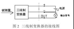 三線制變換器的接線圖如圖 2 所示,電流輸出系統除了兩根電流傳輸線以外,還有一根電源線向變壓器提供電源。三線制就是電源正端用一根線,信號輸出正端用一根線,電源負端和信號負端共用一根線。其供電大多為 DC 24V , 輸出信號有 DC4-20mA ,負載電阻為 250Ω 或者 DC0-10mA ,負載電阻為 0-1.5kΩ ;有的還有 mA 和 mV 信號,但負載電阻或輸入電阻,因輸出電路形式不同而數值有所不同。