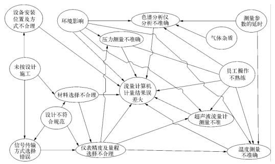 制藥廠污水流量計量系統計量的準確性既與制藥廠污水流量計本體有關,也和壓力、溫度測量儀表、色譜分析儀以及流量計算機等設備的可靠性有直接關系。此外,在員工操作、環境影響、設計選型、設備安裝等方面也會一定程度影響制藥廠污水流量計量的準確性,其影響因素復雜多樣。電磁計量系統計量準確性影響因素關聯關系如圖2所示。在實際生產應用中,對制藥廠污水流量計量準確性造成較大影響的主要是噪音、液體計量雜質、氣體組分分析以及壓力、溫度測量這四個方面。