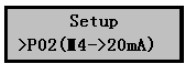 1)在儀表正常工作時按擊Mode鍵進入參數設置菜單后按擊▼鍵選擇P02(4~20mA)設置菜單,如右圖。