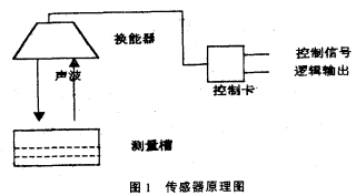 常見的液位傳感器有磁浮筒式、壓力式等,磁浮筒式傳感器要安裝在被測介質(zhì)中,長時間使用易被腐蝕,而壓力傳感器輸出線性較差且成本較高。超聲波傳感器的特點是使用時與液面脫離接觸,無腐蝕問題,且價格低廉。超聲波傳感器由控制卡及換能器構(gòu)成,如圖I。