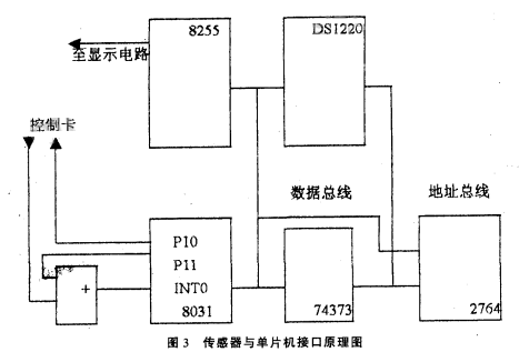 圖3中,單片機(jī)8031、74373和2764組成單片機(jī)核心電路,8255為顯示電路接口,DSl220為不揮發(fā)RAM,用其存儲流量可保證斷電后流量不丟失。工作時8031每隔一個采樣周期先啟動定時器T1,然后通過PIO引腳向控制卡發(fā)控制信號,換能器發(fā)一聲波經(jīng)被測污水反射由換能器接收,控制卡的邏輯輸出端輸出一脈沖,脈沖信號經(jīng)過或門進(jìn)入INTO腳,引起中斷請求。在中斷服務(wù)程序中從定時器中取出定時值,計算出對應(yīng)的液位。由于傳感器在發(fā)出聲波后,在4MS以內(nèi)會產(chǎn)生無用的盲區(qū)脈沖,所以在P10向控制卡發(fā)控制脈沖的同時,通過P11引腳發(fā)一個4ms的高電平封鎖信號,防止“盲區(qū)脈沖”通過或門進(jìn)入INTO引腳。